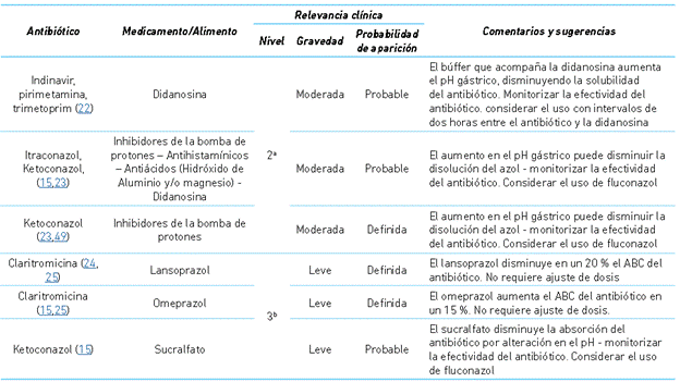 Los antibióticos con mayor número de interacciones de riesgo alto identificadas fueron: las tetraciclinas debido a la formación de complejos insolubles, y ketoconazol e itraconazol debido a variaciones en el pH. Sin embargo, la modificación que puede generar estas interacciones no pone en riesgo la vida del paciente. Por tal razón, como principal recomendación, algunos autores proponen ajustar la posología del tratamiento en intervalos de dos o más horas, evitar el uso simultaneo con medicamentos que afectan el pH o con cationes polivalentes como antiácidos, multivitamínicos, suplementos de calcio, entre otros 13-15.