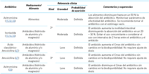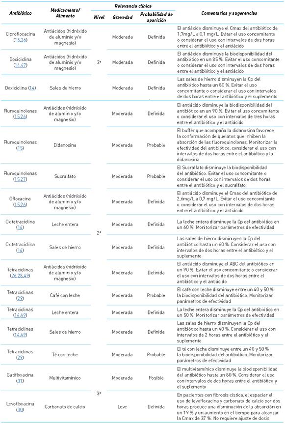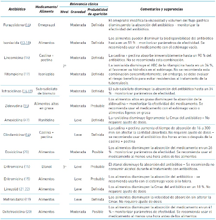 La absorción de antibióticos puede verse afectada notoriamente por la utilización simultanea de medicamentos o alimentos y, a su vez, los antibióticos pueden modificar la biodisponibilidad de otros medicamentos administrados simultáneamente, lo que puede generar interacciones medicamentosas clínicamente relevantes. En esta revisión, de las 63 interacciones identificadas, el 67 % son de riesgo alto.