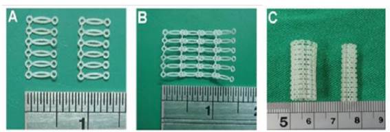 Chao et al. fabrican stents biodegradables de policaprolactona elaborados por una máquina de moldeo por microinyección y los recubren con cisplatin (medicamento basado en el platino y usado en quimioterapia) y un copolímero de PLGA y polietilenglicol (PEG) por el método de aerosol. Realizan un modelo animal con 15 conejos blancos de Nueva Zelanda implantándoles los stents en la tráquea cervical y realizando semanalmente análisis por broncoscopia durante cinco semanas. El análisis histológico realizado muestra un epitelio ciliado intacto y una marcada infiltración de leucocitos en el área del stent. Igualmente, los stents desarrollados presentan propiedades físicas comparables a los stents metálicos con recubrimiento y una liberación sostenida de cisplatino durante cinco semanas, lo cual representa un gran potencial en el tratamiento de la obstrucción maligna de las vías respiratorias 13 (figura 1).