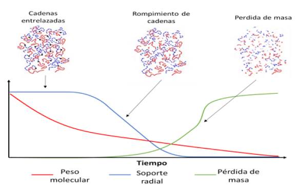 Efecto del peso molecular: polímeros con alto peso molecular generalmente suelen exhibir velocidades de degradación más bajas. El peso molecular tiene una relación directa con el tamaño de las cadenas poliméricas; es así que los polímeros de alto peso molecular que contiene largas cadenas requieren de mayor tiempo para su degradación 23,26.