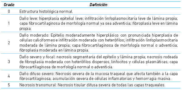 Novotny et al. evaluan stents bioabsorbibles de polidioxanona empleando un modelo animal de tráquea de conejo, buscando evaluar su biocompatibilidad y seguridad. Los autores no reportan muertes y los animales permanecieron en buenas condiciones durante todo el seguimiento. El análisis macroscópico muestra que la luz del stent permanece siempre abierta y el análisis histológico revela un mayor daño después de las cinco semanas del implante. Según el sistema de clasificación para las lesiones de tejido traqueal (cuadro 1), los autores encuentran un daño leve equivalente a 1 en la escala de 0 a 5 16.