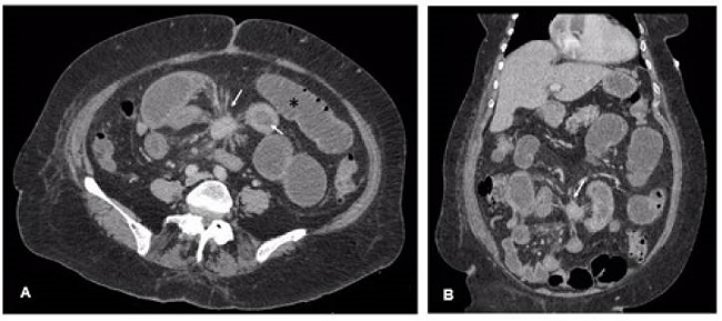 Mujer de 74 años sin antecedentes patológicos conocidos, quien consultó al servicio de urgencias por un cuadro clínico de ocho días de ausencia de deposiciones, distensión y dolor abdominal difuso. En el examen físico de ingreso encuentran dolor a la palpación generalizada del abdomen, sin signos de irritación peritoneal o masas palpables.