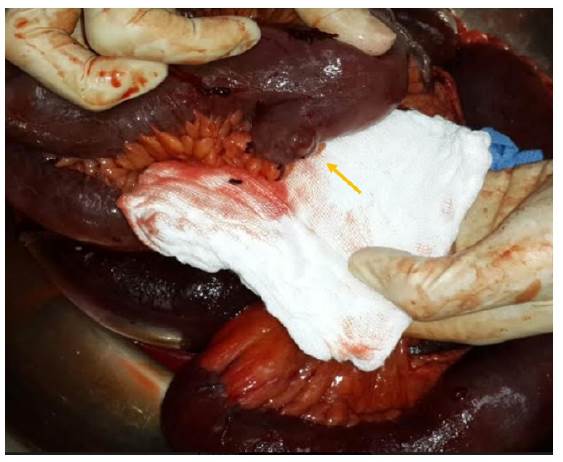 Se realizó resección del segmento comprometido del intestino delgado, incluyendo el divertículo de Meckel y la lesión mesentérica que causaba la obstrucción (figura 2).