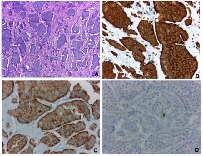 Los resultados de patología del tejido obtenido durante la cirugía reportaron focos de nidos de células poligonales, pequeñas, de citoplasma eosinófilo con patrón infiltrativo sobre un fondo y localizados en el divertículo de Meckel y en la lesión nodular del meso. Se realizaron tinciones de inmunohistoquímica las cuales fueron positivas para los marcadores sinaptofisina y cromogranina, la tinción KI 67 mostró un índice mitótico menor al 1 %. Estos hallazgos fueron compatibles con carcinoma neuroendocrino bien diferenciado (figura 3). Posterior a la cirugía la paciente tuvo una evolución satisfactoria por lo que se dio egreso.