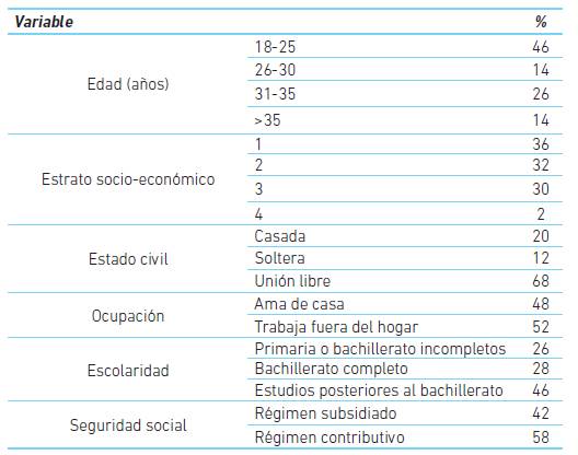 La edad promedio de las gestantes fue de 28,1 ± 6,7 años, la mayoría de las participantes se encontraban en el rango de edad entre 18 y 25 años (46 %). Predominó la convivencia con la pareja (casadas y unión libre). El 68 % de las pacientes pertenecían a un nivel socioeconómico bajo (estratos 1 y 2) y el 52 % trabajaba fuera del hogar. Cerca del 46 % de las pacientes tenían estudios superiores al bachillerato y el 58 % pertenecían al régimen contributivo de seguridad social (cuadro 1).