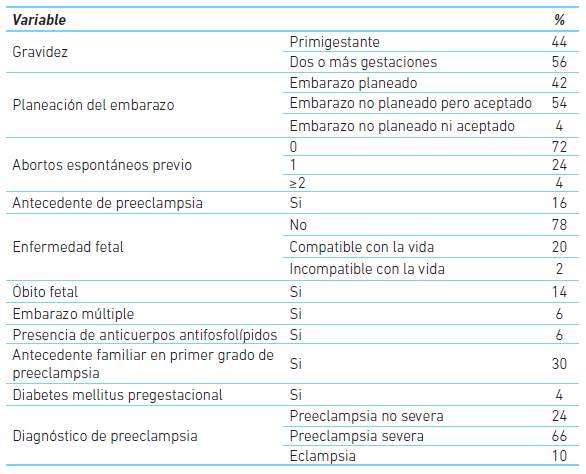 El grupo tuvo una media de edad gestacional de 34 semanas y 90 % se encontraba en el tercer trimestre de embarazo. El 44 % eran primigestante y el 94 % cursaba con un embarazo único (cuadro 2).