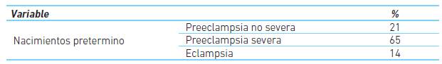 Tuvieron nacimientos pretérmino 38 pacientes, el 21% tenían preeclampsia no severa, el 65% tenían preeclampsia severa y 14% eclampsia.