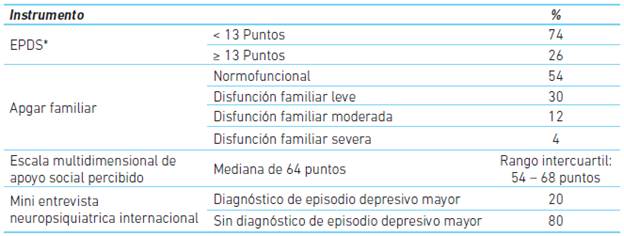 Se emplearon escalas validadas en español y en Colombia: la Escala de depresión postnatal de Edimburgo (EPDS) 17 para determinar la presencia de síntomas depresivos, con un punto de corte de 13 puntos 18, la Mini entrevista neuropsiquiatrica internacional para establecer el diagnóstico de depresión mayor, el Apgar familiar 19 para evaluar la funcionalidad familiar y la Escala multidimensional de apoyo social percibido20 para evaluar el apoyo social. Adicionalmente, se utilizó un cuestionario desarrollado por los investigadores en el que se incluyeron variables sociodemográficas y clínicas.