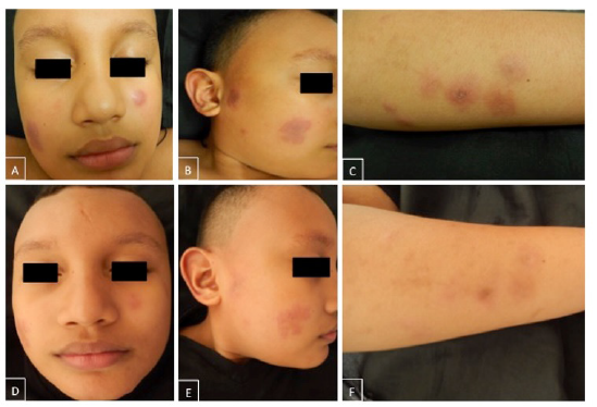 Nine- year-old male patient, with no significant personal or family history, who was taken to a dermatological consultation due to nine-month history of asymptomatic spots on the face, chest and arms. He did not report other skin lesions or systemic symptoms. Physical examination revealed multiple erythematous plaques from 1-4 cm in diameter, infiltrated, with well-defined borders, located on cheeks, preauricular region, left ear, upper limbs and anterior chest (photos 1 A - C). A diagnostic impression of cutaneous lupus erythematosus was performed, and a paraclinical profile was requested for autoimmune diseases, including antinuclear and anti-DNA antibodies, which were reported as negative.