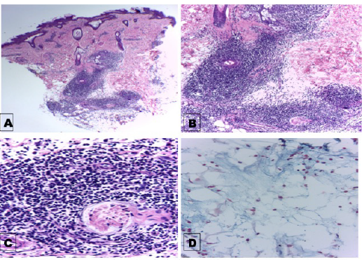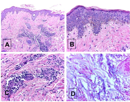 A skin biopsy was carried out, in which epidermis with normal thickness was observed, vacuolization foci in basal lamina; in the dermis, superficial and deep lymphoplasmocytic perivascular and periadnexal inflammatory infiltrate was evidenced, extending to the subcutaneous cellular tissue, focally compromising fat lobules, with the presence of an interstitial filiform gray-blue material compatible with mucin (photo 2).