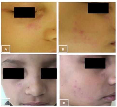 Six-year-old male patient, with no significant personal or family history, who was evaluated by dermatology for a clinical picture of six months of evolution, consisting of erythematosus lesions, located initially in the inner canthus of the right eye, with posterior extension to the cheek. The patient described that with heat, the lesions increased in size and became more erythematous. He did not report additional lesions or symptoms.