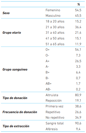 La edad media fue de 34±12,1 años; la mitad de los donantes tenían 31 años. De los 25 391 donantes el 54,5 % correspondió a mujeres y la mayor proporción a edades comprendidas entre 21 y 30 años. Así mismo, el grupo sanguíneo más frecuente fue O positivo (54,1 %), el 81 % de las donaciones fueron voluntarias y el 39 % correspondía a donantes de primera vez (cuadro 1).