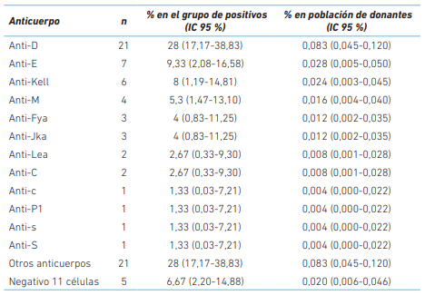 Un total de 75 donantes fueron positivos en la prueba de anticuerpos irregulares, lo que corresponde a una prevalencia del 0,3 % (IC 95 % 0,23-0,36). En estos donantes se logró identificar el tipo de anticuerpo en el 65 % de los casos, siendo mayor anti-D, anti-Kell, anti-E y anti-M (cuadro 2). Cuatro donantes presentaron simultáneamente dos tipos de anticuerpos: en dos se encontró anti-D y anti-C, en uno anti-D y anti-E, y en otro donante anti-E y anti-S.