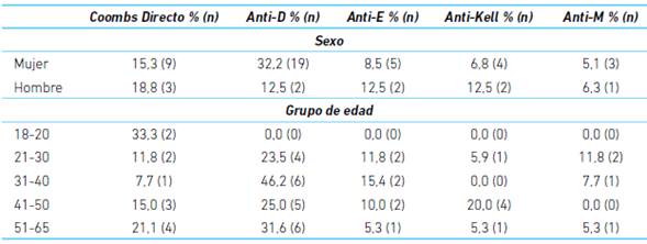 En los análisis de los principales anticuerpos detectados no se hallaron diferencias según el sexo y el grupo etario (p>0,05); sin embargo, el anti-D fue mayor en mujeres y en el grupo etario entre 31 y 40 años; mientras que anti-E fue más frecuente en hombres y edades entre 31 y 40 años, anti-Kell entre 41 y 50 años y anti-M entre 21 y 30 años (cuadro 3).