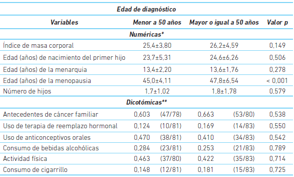 En primera instancia, la edad de diagnóstico fue similar a lo reportado en Molecular Taxonomy of Breast Cancer International Consortium32. Aunque se han descrito múltiples variables no genéticas relacionadas con la ocurrencia del cáncer de mama, en la población de estudio se comportaron de forma homogenea en ambos grupos, exceptuando la edad de menopausia, aunque debe aclararse que solo se analizaron casos y no se incluyó un grupo control. Sin embargo, era necesario establecer si alguna de ellas mostraba diferencias entre los grupos de estudio (mayores de 50 años y menores de 50 años), para su control posterior.