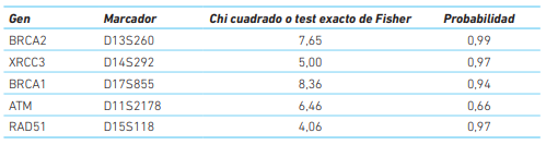Como se conoce que el cáncer puede ser multicausal se procedió a evaluar las interacciones entre los genes usando una prueba de desequilibrio gamético (cuadro 4). Con este análisis se establece si hay una combinación de alelos que se presente con una mayor frecuencia dentro de cada grupo. Particularmente, se detectaron dos combinaciones genéticas (BRCA1-BRCA2 y BRCA2-ATM) en las pacientes menores de 50 años que pueden estar asociadas a esta condición.
