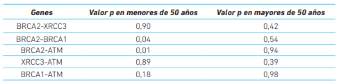 Resultados: no se detectaron diferencias en cuanto a los factores de riesgo no genético entre pacientes mayores y menores de 50 años, ni al evaluar los genes de forma individual. Al comparar combinaciones genéticas se detectaron dos interacciones génicas en mujeres menores de 50 años: BRCA2-BRCA1 (p= 0,04) y BRCA2-ATM (p= 0,008).