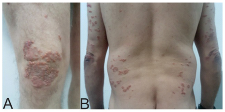 Paciente de 47 años de edad, residente en Medellín, trabaja como conductor de camión. Como antecedentes refería un episodio de pancreatitis aguda de aparente origen alcohólico hacía 2,5 años, consumía alcohol en grandes cantidades y reportaba antecedente familiar de padre con diabetes mellitus tipo 2. Consultó por un cuadro de cuatro meses de evolución que inició con aparición de lesiones en piel dolorosas y pruriginosas, ubicadas en cara anterior de la rodilla derecha, las cuales se generalizaron; refería la presencia de lesiones similares hace cuatro años, las cuales se autolimitaron. Asociado al cuadro refería fiebre no cuantificada, pérdida de peso no cuantificada, poliuria y polidipsia. Fue valorado por los especialistas de dermatología quienes con la sospecha de un granuloma anular o una xantogranulomatosis diseminados, realizaron toma de biopsia y posterior estudio de química sanguínea y hospitalización. Al examen físico se encontraron múltiples pápulas xantomatosas que confluían formando placas con base eritematosa, dolorosas a la palpación, algunas de configuración anular, comprometiendo párpados, cuello posterior, brazos, codos, tórax anterior, abdomen, rodilla y palmas (foto 1).