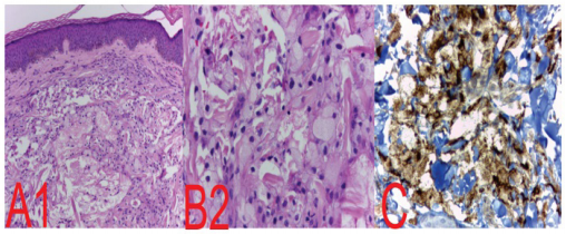 Basados en la historia clínica, el examen físico y los resultados de laboratorios se hizo diagnóstico de hipertrigliceridemia muy grave y diabetes mellitus de novo. Se inició manejo con heparina no fraccionada 5 000 UI subcutáneas cada ocho horas, insulina glargina 10 UI subcutáneas/día, gemfibrozilo 900 mg/día y metformina 850 mg cada 12 horas. Se tomó perfil lipídico a las 48 horas con una disminución del 31,2 % en el valor de triglicéridos y continuó hospitalizado por cinco días más. Fue dado de alta sin presentar complicaciones. El resultado de la biópsia de piel fue compatible con la sospecha diagnóstica (foto 2).