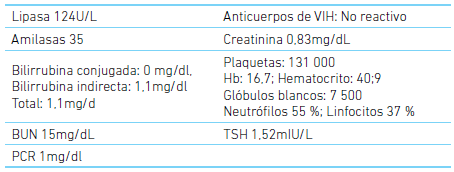 Se realizaron estudios paraclínicos que reportaron: colesterol total: 431 mg/dL; triglicéridos 7 589 mg/dL, lipoproteína de alta densidad (HDL): 15 mg/dL; lipoproteína de baja densidad (LDL) no calculable, no se realizó medición directa; glucemia: 247mg/dL; hemoglobina glicada (HbA1C) 11,94 %; amilasa y lipasa séricas normales. La ecografía de hígado y vía biliar reportó esteatosis hepática con colelitiasis sin colecistis (cuadro 1).