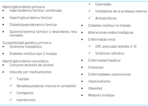 Las causas de la hipertrigliceridemia pueden dividirse en primarias y secundarias; los pacientes con hipertrigliceridemias graves generalmente tienen una superposición de ambas. La mayoría de causas secundarias están asociadas a diabetes y elevado consumo de alcohol 5 (cuadro 2).