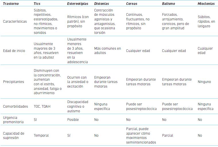 Los tics se incluyen dentro de los trastornos de movimientos hipercinéticos junto con los temblores, las distonías, la corea, el balismo, la atetosis, tics, las mioclonías, la hiperekplexia (o enfermedad del sobresalto), el espasmo hemifacial, las estereotipias y la acatisia. Estos trastornos se caracterizan por un exceso de movimiento o movimientos anormales involuntarios (discinesias). A diferencia de los demás trastornos, los tics son irregulares, suprimibles durante periodos cortos de tiempo y son los únicos que se pueden reproducir a voluntad 11. En el cuadro 1 se presentan las características de los diferentes movimientos hipercinéticos 8,13. Estas características se evaluaron en el paciente y permitieron identificar el trastorno por tics.