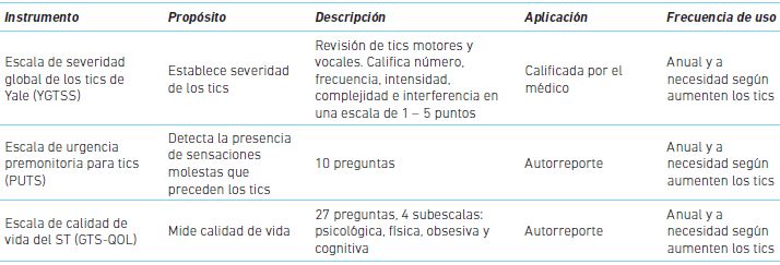 Durante la evolución del caso no se cuantificó su severidad, pero según las escalas presentadas 13 se corrobora una gran afectación: la escala YTGSS del paciente fue: puntaje total de severidad de tics = 40/50, Puntaje de severidad global = 80/100) (cuadro 2) 24.