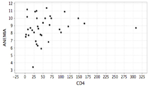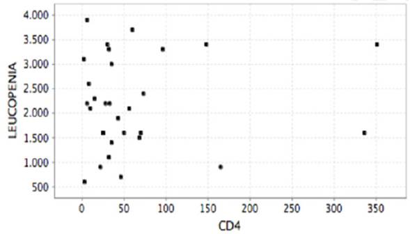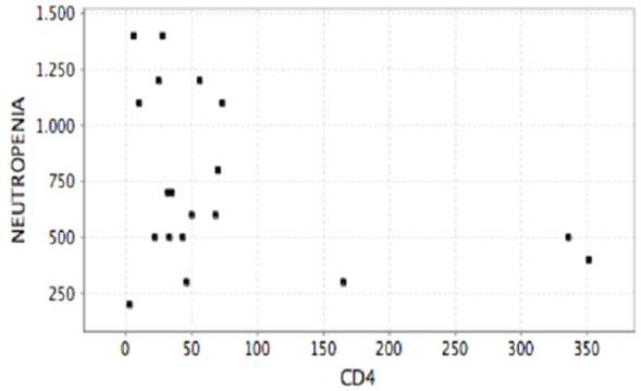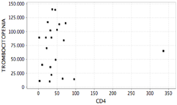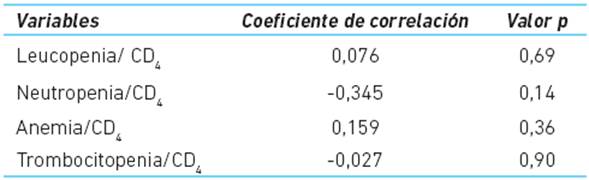 Pese a que se pudo notar una tendencia de asociación entre la disminución de los linfocitos T CD4 y el incremento de la posibilidad de tener alteraciones hematológicas, no se encontró correlación significativa. Lo anterior posiblemente explicado por el número pequeño de pacientes incluidos en el análisis.