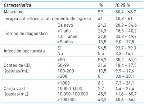 Se encontró un predominio del sexo masculino con una mediana de edad de 35 años. En cerca de la mitad de la población el tiempo de diagnóstico de infección por VIH fue inferior a un año y casi la totalidad de los pacientes cumplían con categoría de sida. En 59 % de los casos no recibían tratamiento antiretroviral, un hallazgo relacionado con altas cargas virales (Cuadro 1).