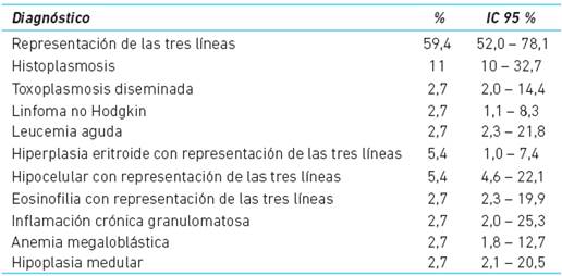 En el 27 % de los estudios anatomopatológicos de médula ósea se pudo realizar un diagnóstico etiológico definitivo y la infección oportunista por histoplasmosis fue la más frecuente. En dos casos se encontró neoplasia en medula ósea: uno con linfoma no Hodgkin y otro con leucemia aguda (Cuadro 2).