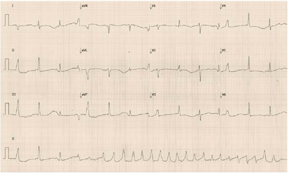 A la institución de tercer nivel ingresa somnolienta, deshidratada, con crépitos bibasales, desaturada, electrocardiograma con QTc largo, mayor a 500 milisegundos (Figura 1) y episodios frecuentes de complejos ventriculares prematuros y taquicardia ventricular no sostenida, tipo torsade de pointes; posteriormente, desarrolló nuevo episodio de taquicardia ventricular polimórfica sostenida e hipotensión, por lo cual, fue llevada a sala de reanimación en donde se realizó desfibrilación exitosamente.