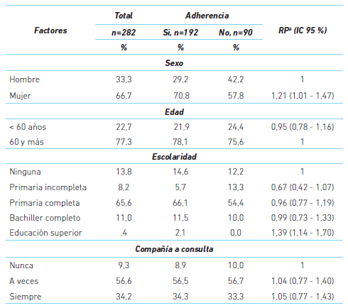 Se analizaron 282 pacientes. La mediana de la edad fue de 67 años (rango inter- cuartil -RIQ- 16), el 66,7 % fueron mujeres, 80,9 % residía en el municipio de Pasto, 82,3 % provenía de zona urbana, en su mayoría vivían en estrato medio (75,9 %) o bajo (24,1 %). Con respecto a la etnia, el 99,3 % fueron mestizos; el 96 % refirió vivir con familiares y el 3 % vivían solos. El 53,5 % estaban casados o en unión libre, el 31,6 % separados o viudos y el 14,9 % solteros. El 97,5 % de los pacientes pertenecía al régimen subsidiado en salud. Ninguna de estas características se asoció con la adherencia (cuadro 1).