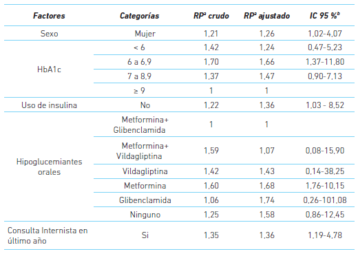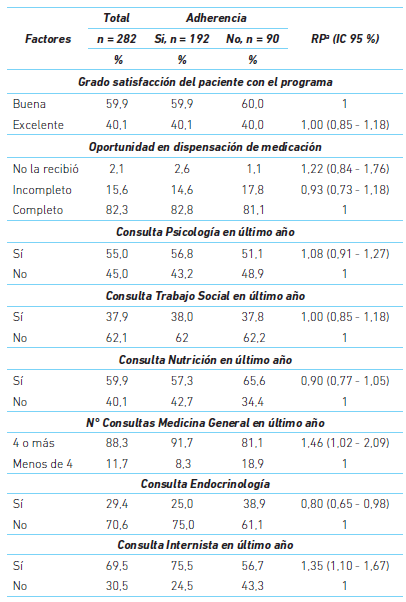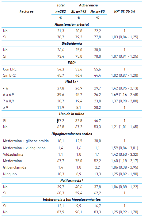 Resultados: la mediana de la edad fue de 67 años, 33 % fueron hombres y la proporción de adherencia del 68 %; los factores que se asociaron independientemente fueron, ser mujer RP: 1,25 (IC 95 %: 1,02-4,07), hemoglobina glicosilada entre 6 y 6,9 % RP: 1,66 (1,37-11,80), no uso de insulina RP: 1,36 (1,03-8,52), empleo de solo metformina RP: 1,76 (1,76-10,15) y consulta por medicina interna RP: 1,19 (1,19-4,78).
