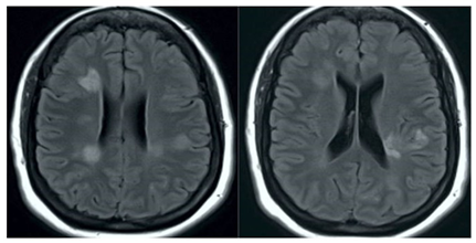 Una resonancia magnética cerebral mostró áreas con refuerzo y señales hiperintensas en la sustancia blanca de la región periventricular de ambos hemisferios cerebrales con restricción ligera de la difusión (figura 1). La angiografía por resonancia magnética no mostró ninguna anomalía en las principales arterias cerebrales. En el electroencefalograma se encontró actividad epileptiforme en la región temporal izquierda. La punción lumbar mostró leucocitosis y aumento de las concentraciones de proteínas totales con valores de glucosa normales. Las pruebas para antígenos, tinción de Gram y citología para neoplasia fueron negativas. El análisis de la reacción de cadena de polimerasas en el liquido cefalorraquídeo no fue realizado.