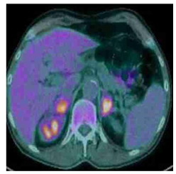 En vista de los hallazgos se realizó resonancia magnética de región abdominopélvica que encontró tumor nodular en la glándula suprarrenal izquierda. La prueba para síndromes para-neoplásicos fue negativa. La tomografía con emisión de positrones demostró intensa acumulación de 18-fluorodeoxiglucosa en ambas glándulas supra- rrenales, sin captación anormal en otras localizaciones (figura 2).