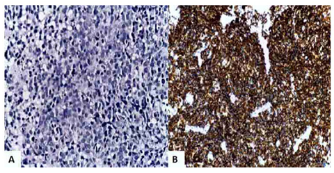 Se decidió realizar biopsia de la glándula suprarrenal afectada por la lesión encontrando estructuras vasculares dilatadas con presencia de infiltración difusa por células B grandes con nucléolos prominentes ubicadas exclusivamente en el lumen del vaso sanguíneo (figura 3). La inmunotinción fue positiva para BCL2, CD20, CD31, CD45 PAX 5, CD79a y negativa para CD68, CD3 y mieloperoxidasa. El análisis citogenético demostró un cariotipo normal (46XX) y el análisis FISH fue negativo para BCL-1, BCL-2 y BCL-6. No se realizó la determinación de virus linfotropo humano 1 y 2. La biopsia de medula ósea no mostro afección linfomatosa. Basándose en los hallazgos, el diagnóstico anatomopatológico fue de linfoma intravascular de células B grandes.