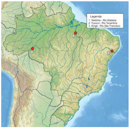 Diante dessa caracterização generalista de cachoeiras, propomos abordar sucintamente três contextos geográficos distintos, a fim de verificar seu potencial histórico/arqueológico. As áreas de estudo são: (I) a cachoeira de Teotônio, no alto rio Madeira; (II) a de Tucuruí, no rio Tocantins e, por fim, (III) as corredeiras de Xingó, no rio São Francisco (Figura 1). Essas áreas foram escolhidas porque são foco de pesquisas dos autores durante os últimos anos. Para quase todas as demais cachoeiras brasileiras que foram transformadas em hidrelétricas existem estudos arqueológicos particulares - de licenciamento e/ou acadêmicos (Miller et al., 1992, por exemplo) - que permitem visualizar diferentes contextos com a presença de bolsões de história.