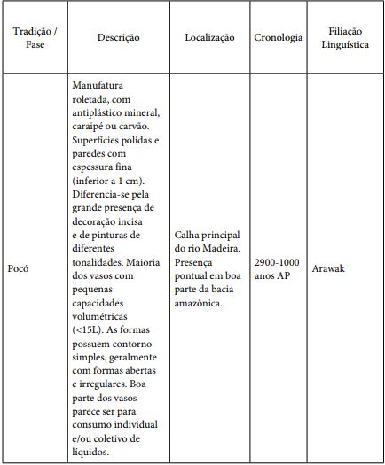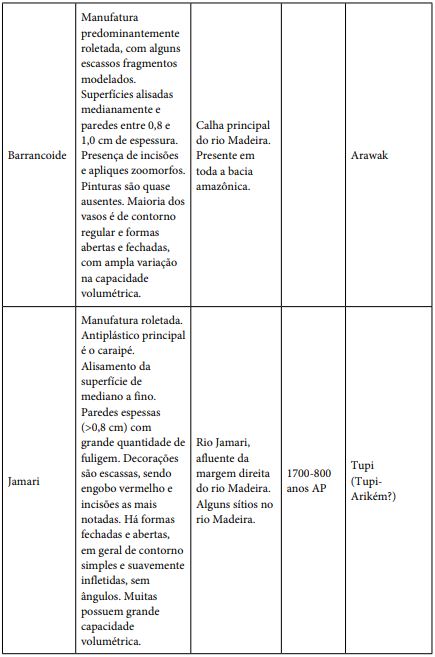 O grande diferencial dos sítios próximos à cachoeira é que o registro encontrado parece agregar atributos cerâmicos que se espalham isoladamente em boa parte dos sítios existentes tanto nos afluentes quanto na calha do Madeira. O Quadro 1 apresenta uma relação generalista a respeito dos diferentes conjuntos cerâmicos identificados na área da cachoeira do Teotônio. Por não ser nosso intuito neste artigo, a discussão arqueológica a respeito da tecnologia de fabricação cerâmica não será esmiuçada. Outra advertência é que a associação entre os conjuntos cerâmicos e as famílias linguísticas deve ser pensada como válida para processos multivariados e em grandes escalas espaciais - e não como uma relação obrigatória (Almeida; Neves, 2015).