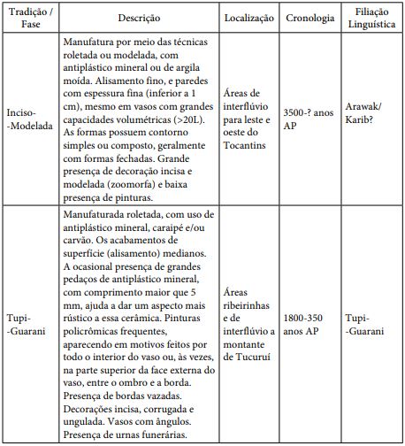 Podemos denominar o conjunto mais antigo da bacia do baixo Tocantins, com datações atingido 3.500 anos AP, de cerâmica Inciso-Modelada. No início da era Cristã surge um segundo conjunto cerâmico, relacionado à Tradição Tupi-Guarani, ligado à família linguística homônima (Quadro 2). A variabilidade e profundidade cronológica do material arqueológico, assim como a diversidade das línguas Tupi-Guarani encontradas na região, permitem que se especule que foi a partir da região Xingu-Tocantins que esses grupos começaram a migrar e a se expandir para outras áreas das terras baixas sul-americanas (Almeida; Neves, 2015).