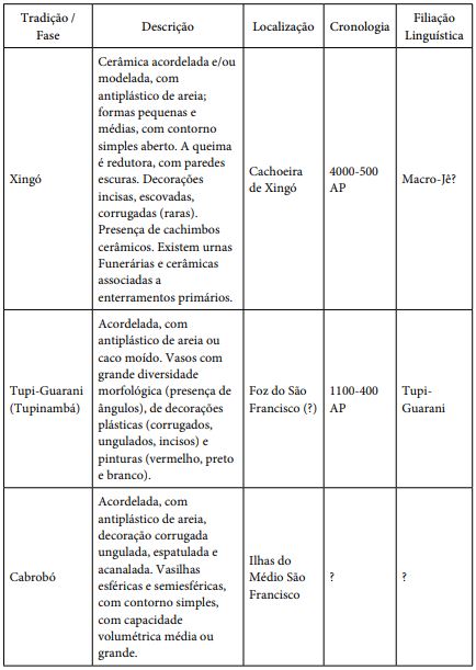 É possível perceber a presença dos Tupinambá rondando o baixo São Francisco em elementos exóticos identificados na cerâmica, como pontual presença de decoração corrugada, mas não é possível mapear formalmente tal existência. Ainda não foram identificados sítios Tupinambá nessa região. A influência Tupinambá também é vista nas ilhas do médio São Francisco, onde foram identificadas urnas funerárias globulares (comuns às cerâmicas Jê) cobertas com os tradicionais corrugados Tupinambá (Oliveira, 2016). Resta saber, nesse caso ainda não datado, se essa combinação de elementos está relacionada ao período pré-colonial ou se resulta do agrupamento de diferentes coletivos nas missões jesuíticas que foram erguidas nas mesmas ilhas ou em suas proximidades, durante o início do período colonial (cf. Nantes, 1979). Se pensarmos nas ilhas fluviais dos mais diversos contextos também como potenciais lugares significativos, seremos obrigados a não descartar a hipótese de que se trata de um fenômeno pré-colonial.