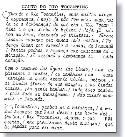 As preocupações com as ameaças à vida ribeirinha já haviam aparecido bem antes do enchimento da barragem, como o indicam os versos deste caderno de cânticos da Prelazia de Cametá: