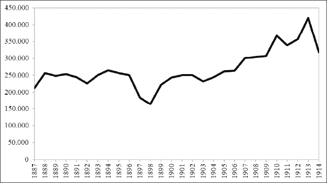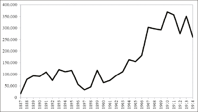 A resolução dessas fricções ocorreu em 1902, quando a WIPGR foi arrendada pela SMR.13 Em termos operacionais, o acordo fez da WIPGR uma parte do sistema SMR, e deu a esta um incentivo para tornar a linha lucrativa. Entre 1888 e 1901, a tonelagem média transportada anualmente pela WIPGR era de 85 mil toneladas (Figura 3). Esse número aumentou para 250 mil toneladas anuais no período de 1902-1914. A média anual de tráfego de passageiros na virada do século era de 236 mil até 1902, mas aumentou para 310 mil no período de 1903-1914 (Figura 4). A SMR utilizava Mormugão para o carvão, suprimentos e material de construção para atender à sua rede em expansão no sul de Deccan. Em 1905, a SMR planejou uma rota mensal de barcos a vapor da Europa para Mormugão, passando por Lisboa, mas um boicote em Bombaim deu fim ao experimento (Ethell, 2003, p. 73). A fortuita descoberta de depósitos de manganês em Deccan e Goa (onde cerca de 20 minas operavam em 1907) forneceu um volume considerável de tráfego de minério para Mormugão - 41.377 toneladas carregadas em 1906, tendo sido de 1.200 toneladas em 1905.14