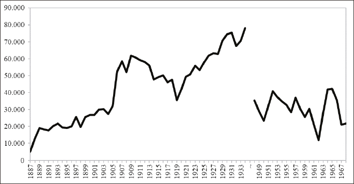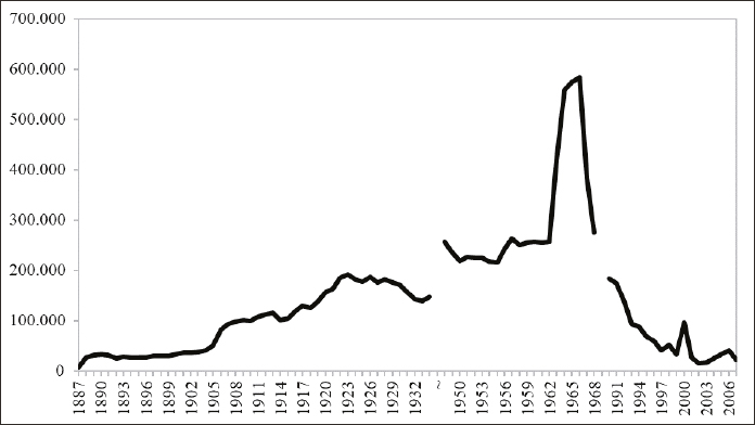 As pessoas da região tiraram proveito do novo serviço. O tráfego de passageiros cresceu constantemente, embora até 1910 o fator de carga dos trens estivesse ainda pela metade, subindo para 70% entre 1918 e 1929. A Figura 6 demonstra o tráfego de passageiros entre 1887-2007. É provável que alguns desses passageiros fizessem apenas uma viagem de um trecho, saindo de Trás--os-Montes: usavam a linha para emigrar. Estudos recentes sugerem que na região norte, interior de Portugal, as ferrovias serviam mais para levar as pessoas para fora dessas regiões do que para ajudá-las a ficar, um fenômeno particularmente visível nas paróquias que tinham uma estação de trem (Silveira et al., 2011). Indiferente ao fato de a emigração ser benéfica ou prejudicial, a linha do Tua facilitou o movimento para fora da região.18