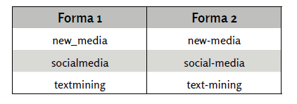 Así mismo, dado que el gestor no permite ingresar espacios entre los términos de una etiqueta, se han observado casos en los que se han utilizado distintos tipos de guiones para unir las palabras. Algunos ejemplos de estas variaciones son: