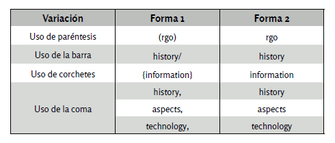 Resulta llamativo que, a diferencia de los otros dos gestores estudiados, las principales variaciones se observan en el uso adicional de algún signo de puntuación o símbolo, tales como los paréntesis, la barra, la coma o los corchetes. Estas variaciones son: