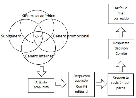 De igual manera, podemos decir que en el contexto de los procesos editoriales de las revistas científicas se genera una cadena de textos que inicia frecuentemente, según la decisión de los editores o comités editoriales, con el diseño y difusión de anuncios de CFP a través de medios de comunicación (sitios web, bases de datos, redes sociales, etcétera) para promocionar la revista o para llamar a publicar en una edición en particular. Estos anuncios atraerían la atención de posibles interesados que planearían con anticipación la redacción de artículos completos que se postulan posteriormente a todo el proceso editorial, formando en cada paso un género textual distinto (Figura 1).