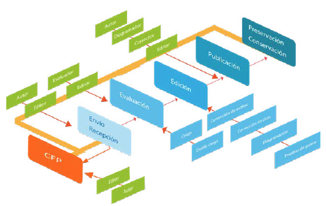Así pues, los anuncios de CFP son un subgénero académico de tipo informativo y promocional que se difunden en especial por Internet para invitar a posibles autores para que publiquen en las ediciones de una revista científica. Aunque no todos los editores o comités editoriales utilizan los CFP como parte de sus procesos editoriales, ni todos los autores envían sus manuscritos por estos anuncios, el diseño y difusión bien pueden posicionarse cuando son utilizados como una etapa previa a la recepción de los manuscritos, y pueden servir a los editores para organizar todas las etapas subsiguientes de evaluación, edición, publicación y preservación. Como también pueden serles útiles a los autores para que planeen con anticipación la redacción y el envío de sus manuscritos (Figura 2).