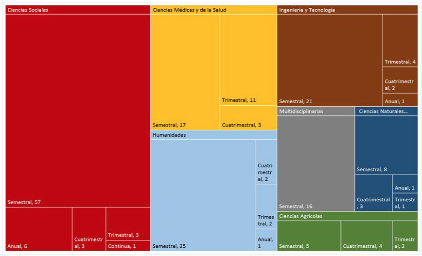 La mayor parte de las 199 revistas estudiadas corresponden al área de Ciencias Sociales, es decir, el 35, 1% (70 revistas); el 15,5% (31 revistas) a Ciencias Médicas y de la Salud; el 15% (30 revistas) a Humanidades; el 14% (28 revistas) a Ingeniería y Tecnología; el 8% (16 revistas) al área de Multidisciplinarias; el 6,5% (13 revistas) a Ciencias Naturales y Exactas; y el 5,5% (11 revistas) al área de las Ciencias Agrícolas. La periodicidad de estas revistas es la siguiente: 149 son semestrales (75%), 23 trimestrales (11,5%), 17 cuatrimestrales (8,5%), 9 anuales (4,5%) y solo una revista con periodicidad continua, como se muestra en la Figura 3.