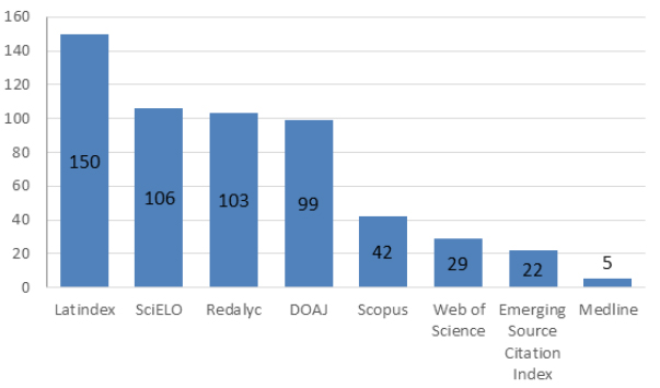 En relación con la presencia en bases de datos de este grupo de revistas analizadas, se constata el hecho, ya conocido, de que son muy pocas las revistas colombianas que se encuentran en índices internacionales donde se calculan indicadores de impacto como WoS o Scopus (Departamento Administrativo de Ciencia, Tecnología e Innovación – Colciencias, 2016: 12), pero cabe anotar que muchas de ellas se encuentran en varios índices al mismo tiempo (SciELO, Redalyc, DOAJ, Latindex, etcétera). En este estudio, el 14,5% de las revistas (29) se encuentran indexadas en WoS y el 21% (42) en Scopus. El 11% de las revistas encuestadas (22) comenzaron a ser tenidas en cuenta por el Emerging Sources Citation Index - ESCI (Figura 4). En cambio, las bases de datos que parecen tener poblaciones representativas de este subconjunto de revistas colombianas son, Latindex, SciELO, REDALYC y DOAJ.