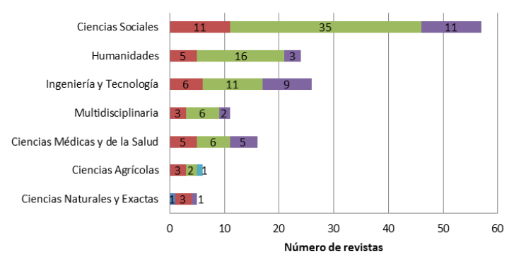 En el caso de las revistas colombianas, de acuerdo con el Observatorio Colombiano de Ciencia y Tecnología (2014), 88% son editadas por universidades y dependen para su funcionamiento de decisiones administrativas; además, son frecuentemente manejadas por profesores adscritos a una unidad académica que, de manera artesanal y con escaso personal de apoyo técnico y académico, y pocas horas a la semana, intentan cumplir –con grandes dificultades– la periodicidad definida. El Departamento Administrativo de Ciencia, Tecnología e Innovación Colciencias, el IBN-Publindex registró 542 revistas en el 2014 (2016: 6)3, 27 más que las registradas en 2013 (Rodríguez, Naranjo, y González, 2015: 32). De estas revistas, solo el 13,8% (75 títulos) se encuentra incluido en índices bibliográficos citacionales que elaboran anualmente evaluaciones sobre su factor de impacto, como Web of Science (WoS) y Scopus (Departamento Administrativo de Ciencia, Tecnología e Innovación-Colciencias, 2016: 6).
